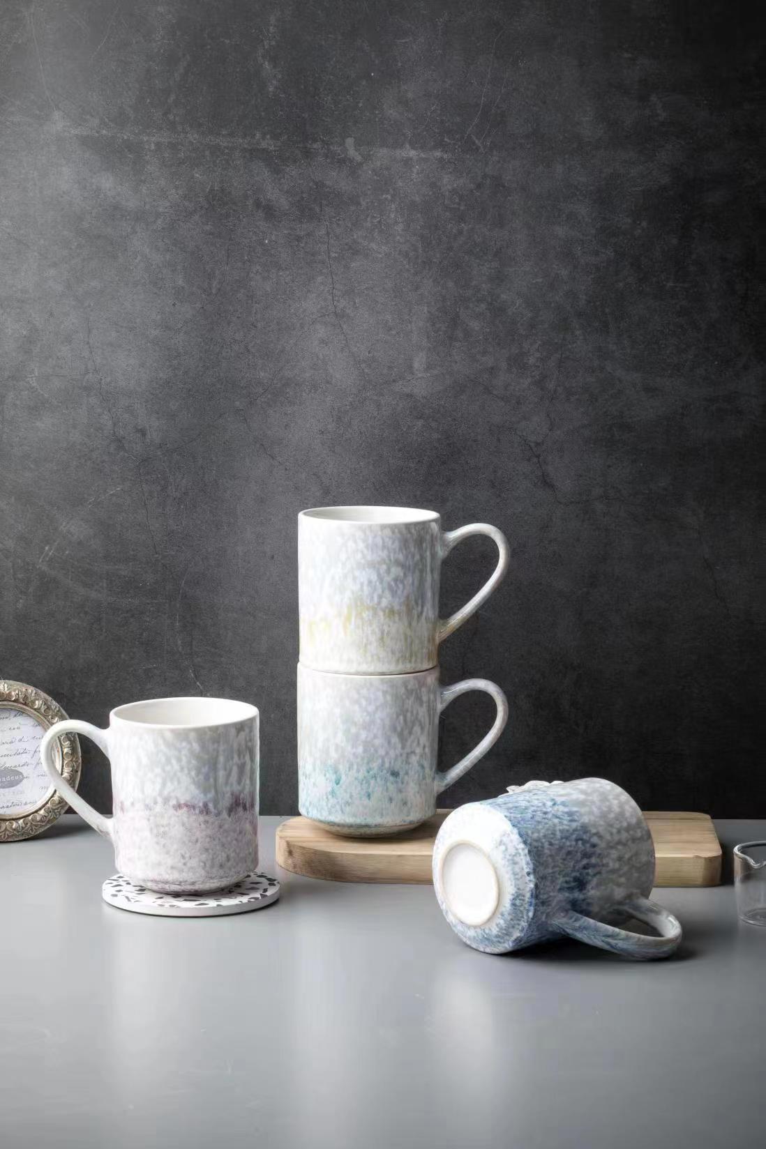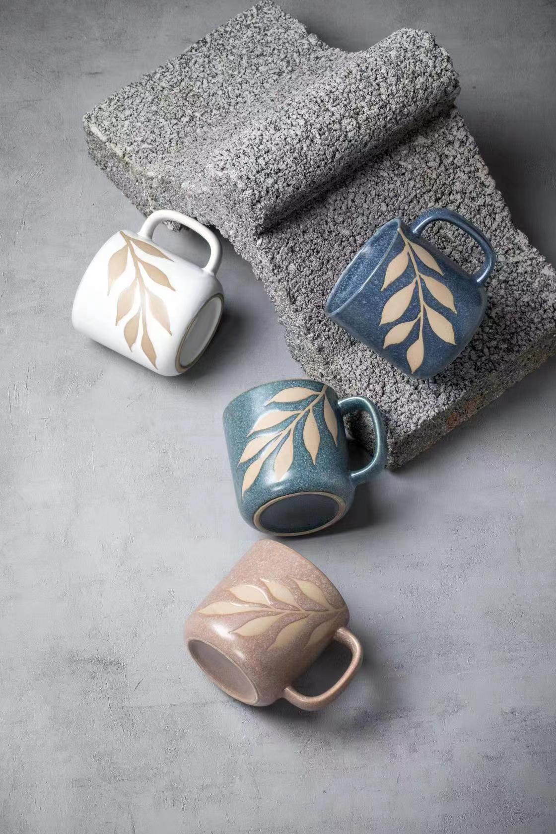 Stoneware mug set matte reactive glaze embossed lines YX076