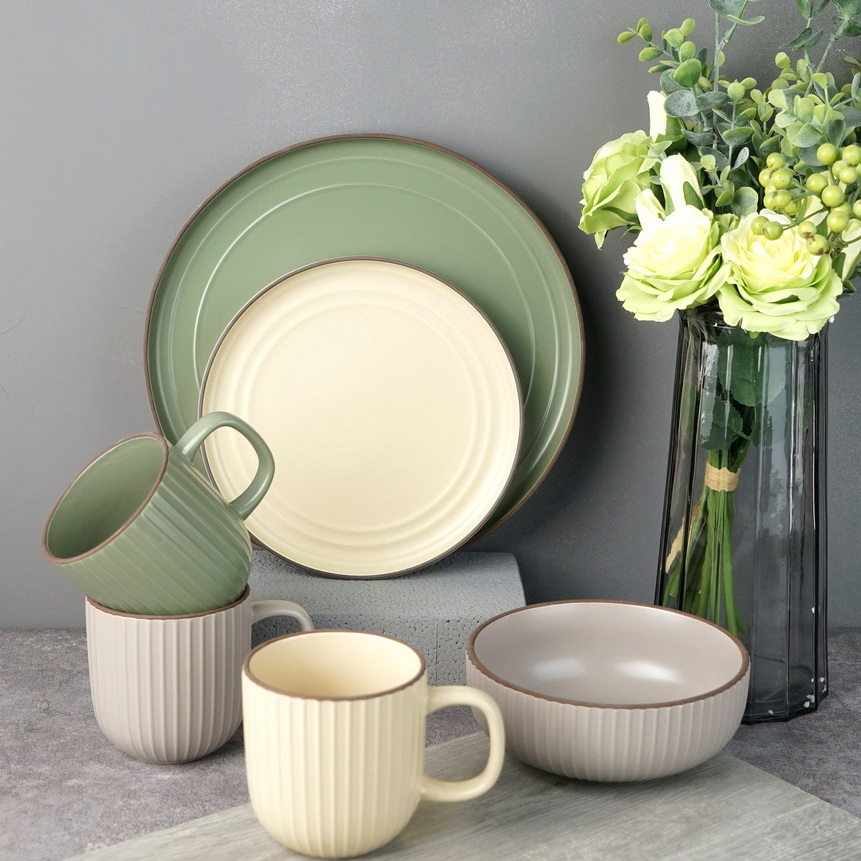 stoneware dinnerware set green cream color embossed lines LS086